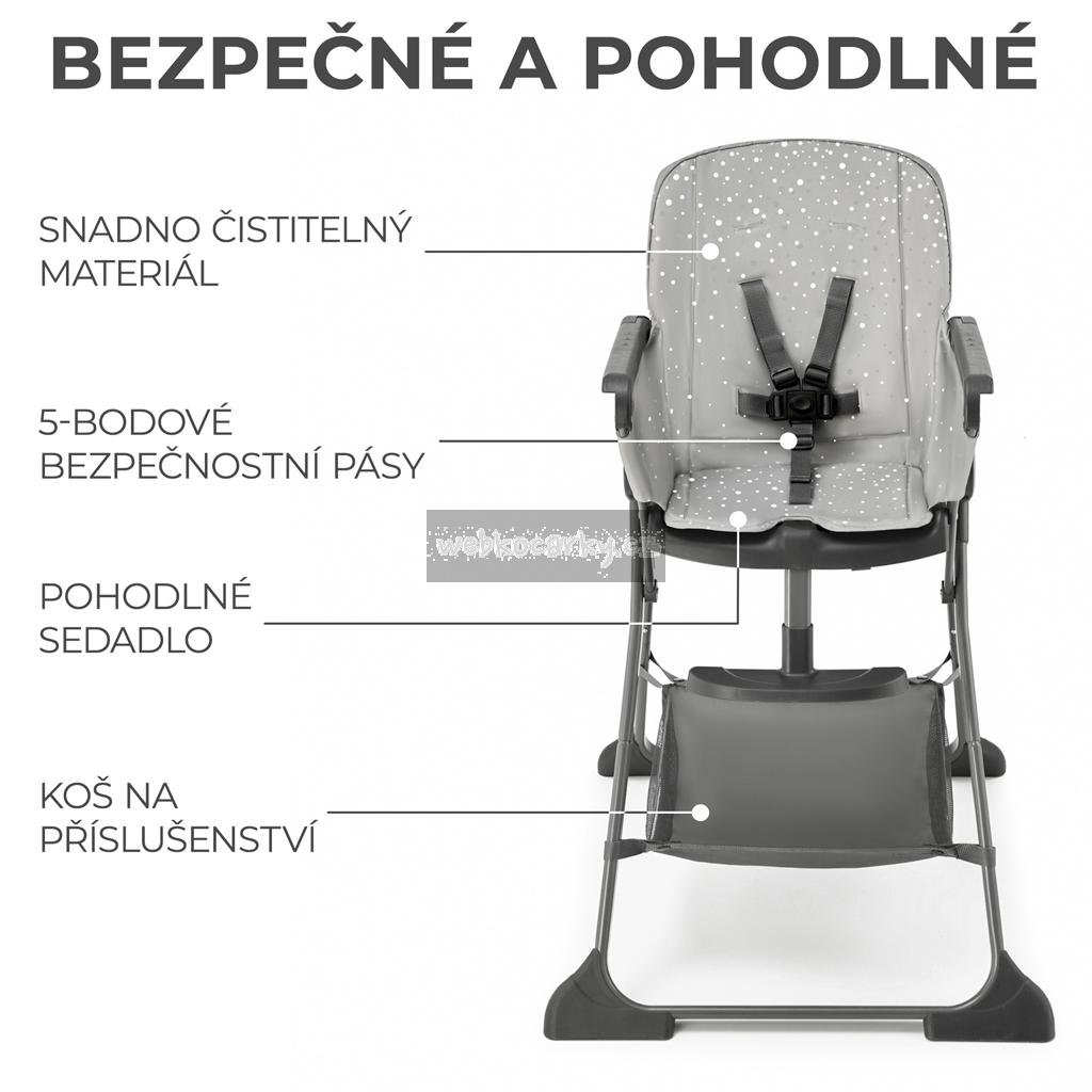 FOLDEE má velké sedadlo, které je vyrobeno ze snadno omyvatelného materiálu. Snadno z něj odstraníte i ty nejodolnější skvrny od jídla. Židlička je bezpečná: má 5-bodové nastavitelné pásy, které lze v případě potřeby odejmout a vyprat. Pod sedadlem je košík na drobnosti, jako jsou vlhčené ubrousky nebo náhradní bryndáček.