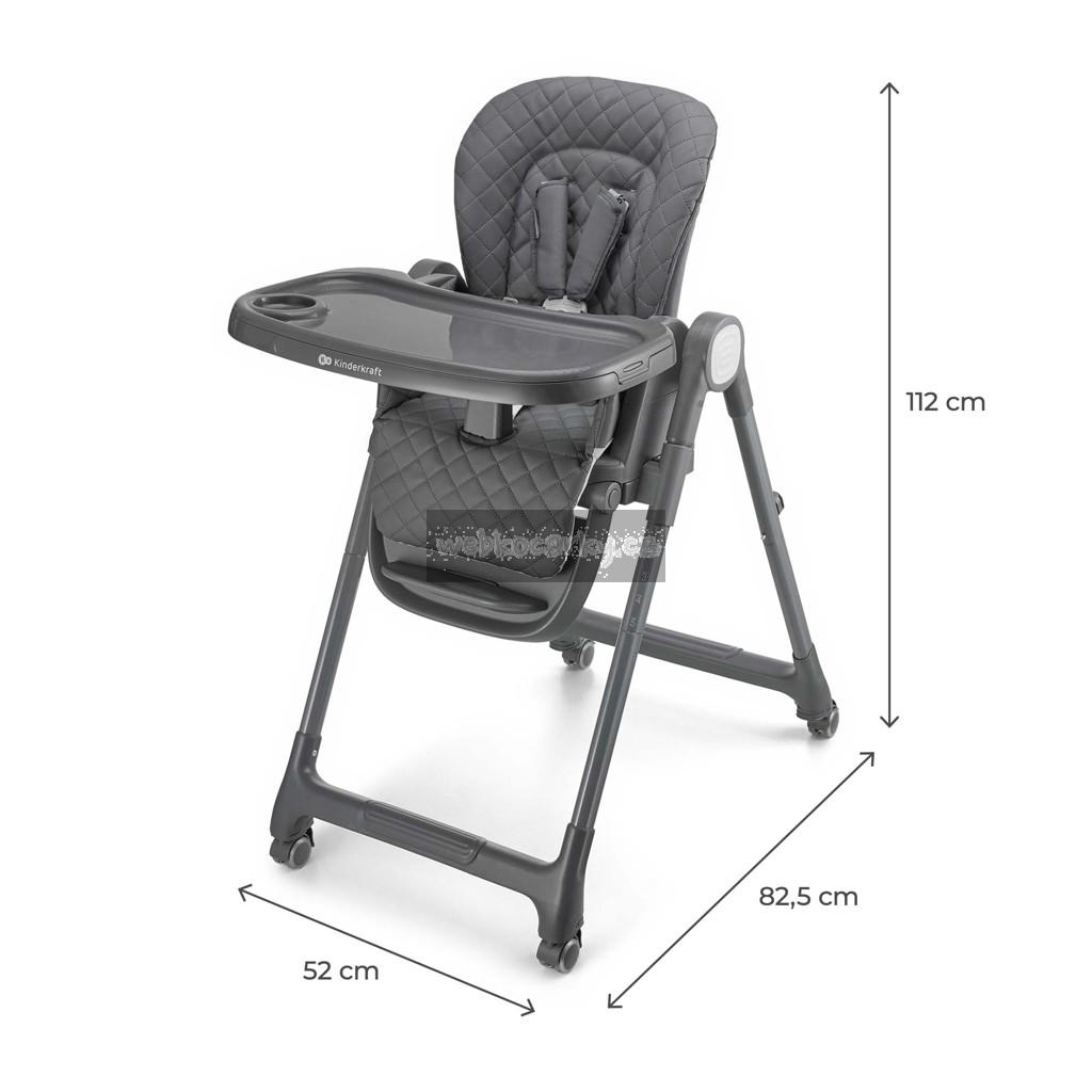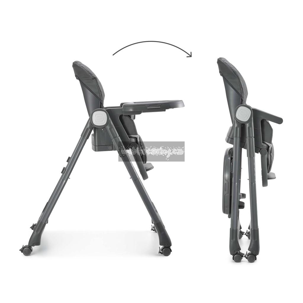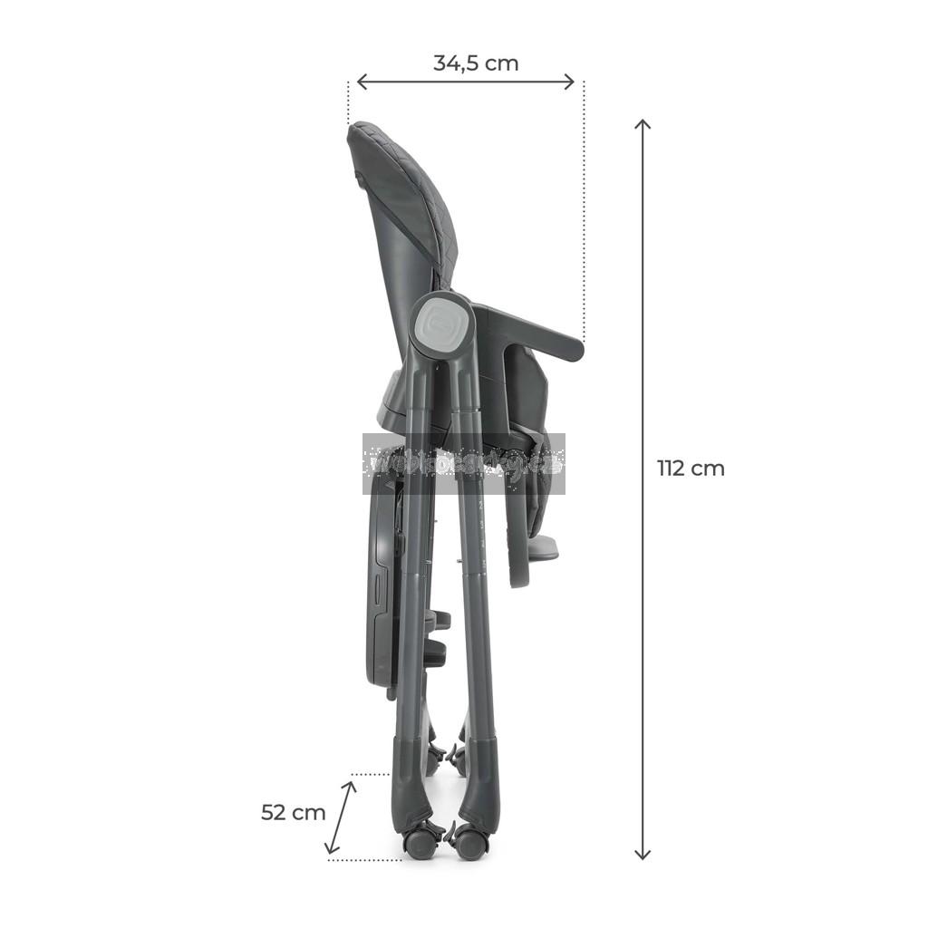 Integrovaná kolečka s brzdami, 5-bodové bezpečnostní pásy a měkké, snadno čistitelné PU čalounění zvyšují pohodlí a bezpečnost dítěte. Po složení má židle mimořádně kompaktní tvar, což usnadňuje její uskladnění. Zabírá minimum místa, takže se snadno vejde do rohu nebo skříně.