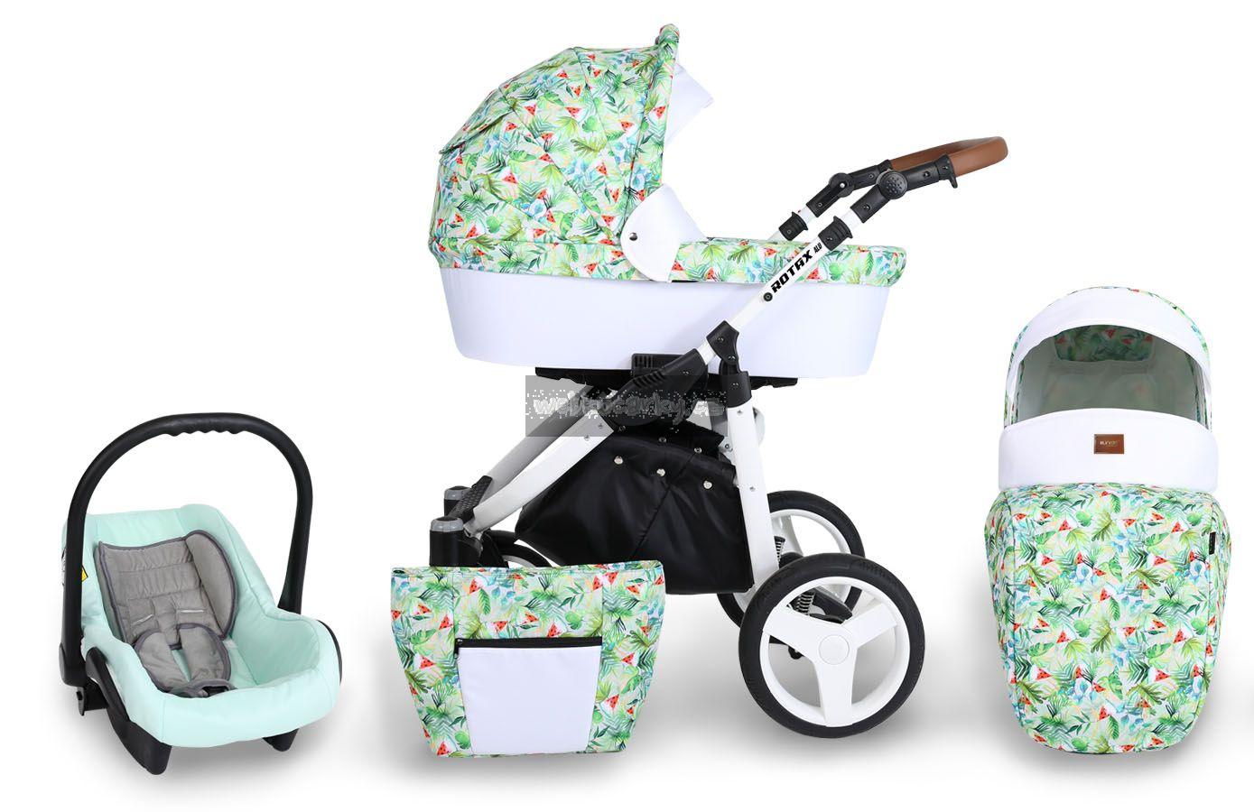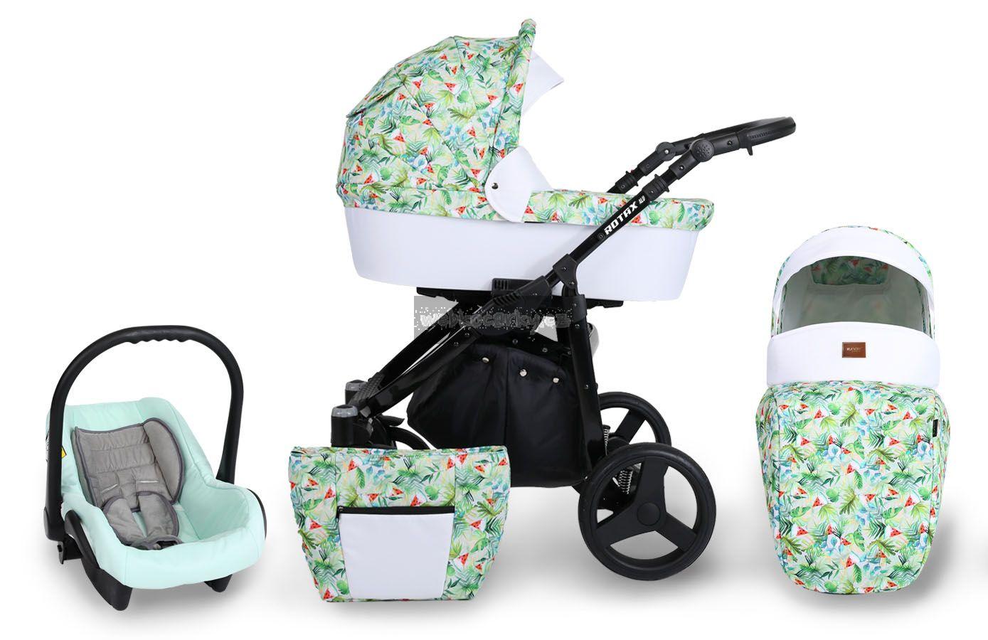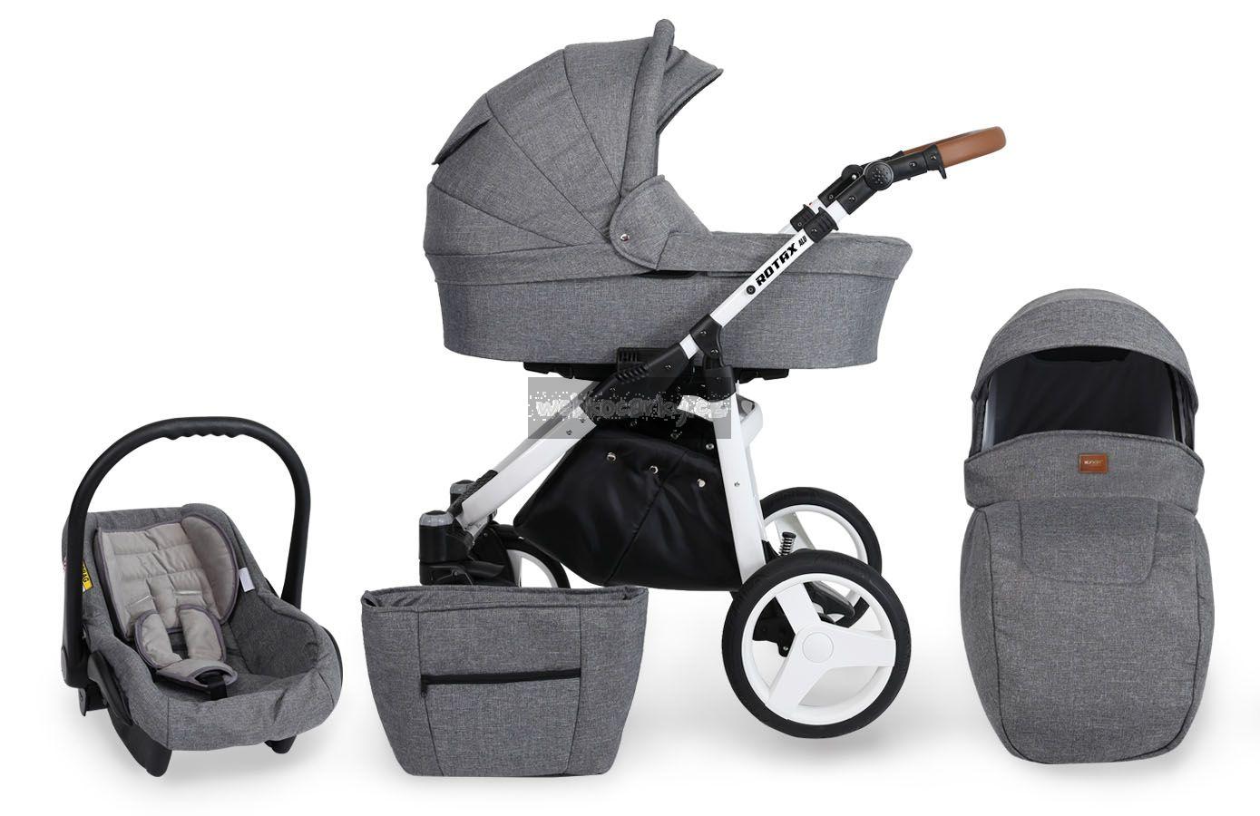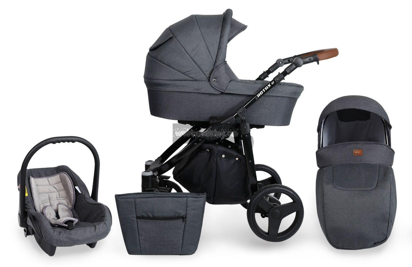 Autosedačka lze pomocí adaptéru připevnit ke kočárku. 3-bodové bezpečnostní pásy, nastavitelné madlo, odnimatelná boudička, nánožník, novorozenecká vložka, adaptéry pro uchycení na kočárek. Autosedačka může být připravena pro Iso-Fix Bázi (uveďte v poznámce u objednávky).