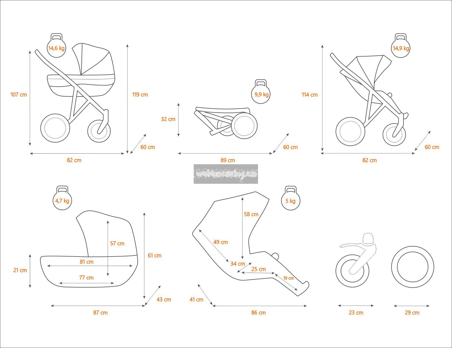 Podvozek, Hluboká korba, Sportovní sedačka s nánožníkem, Nákupní košík, Prostorná taška, Pláštěnka, Držák na láhev