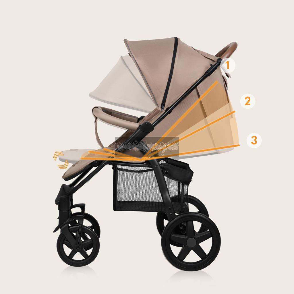 Pohodlí pro dítě: Prostorné sedadlo v kombinaci s 3stupňovým nastavením opěradla přispívají k tomu, že dítě může v kočárku volně odpočívat. Samotné opěradlo lze nastavit do polohy vleže, která umožňuje zdřímnutí. Navíc 6stupňové nastavení výšky opěrky nohou umožňuje dítěti zaujmout ergonomickou a stabilní polohu. V sadě je navíc moskytiéra, nánožník a držák na hrnek, které zvyšují pohodlí na každé procházce.