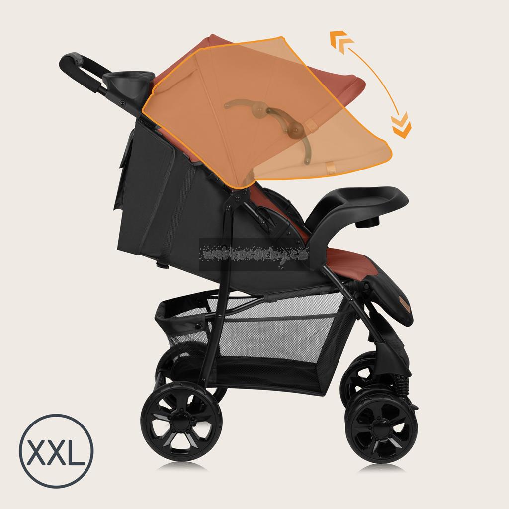 Sedačka se stříškou XXL: Velkorysá sedačka poskytuje dítěti dostatek prostoru pro pohodlnou pozici. XXL stříška účinně chrání před sluncem, deštěm a větrem. Procházka je pro batole pohodlná a příjemná.