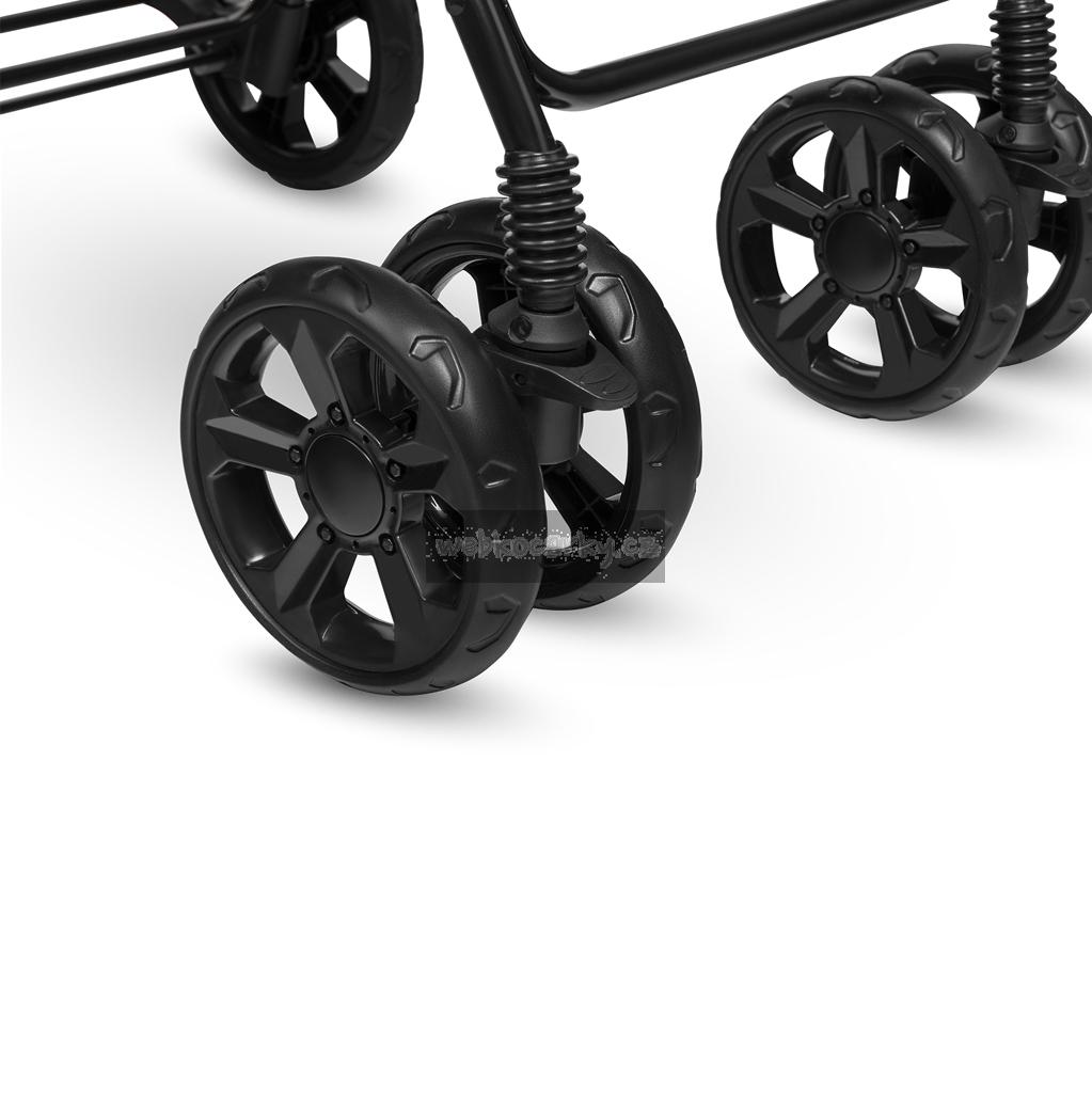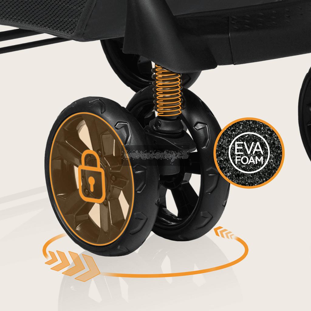 Bezúdržbová kola: Kola s dlouhou výdrží z pěny EVA jsou jsou odolná proti propíchnutí a není třeba je hustit. Proto je kočárek připraven na procházku, kdykoli ho potřebujete! Přední kola jsou vybavena odpružením nárazů a blokováním zatáčení, což usnadňuje houpání při usínání.