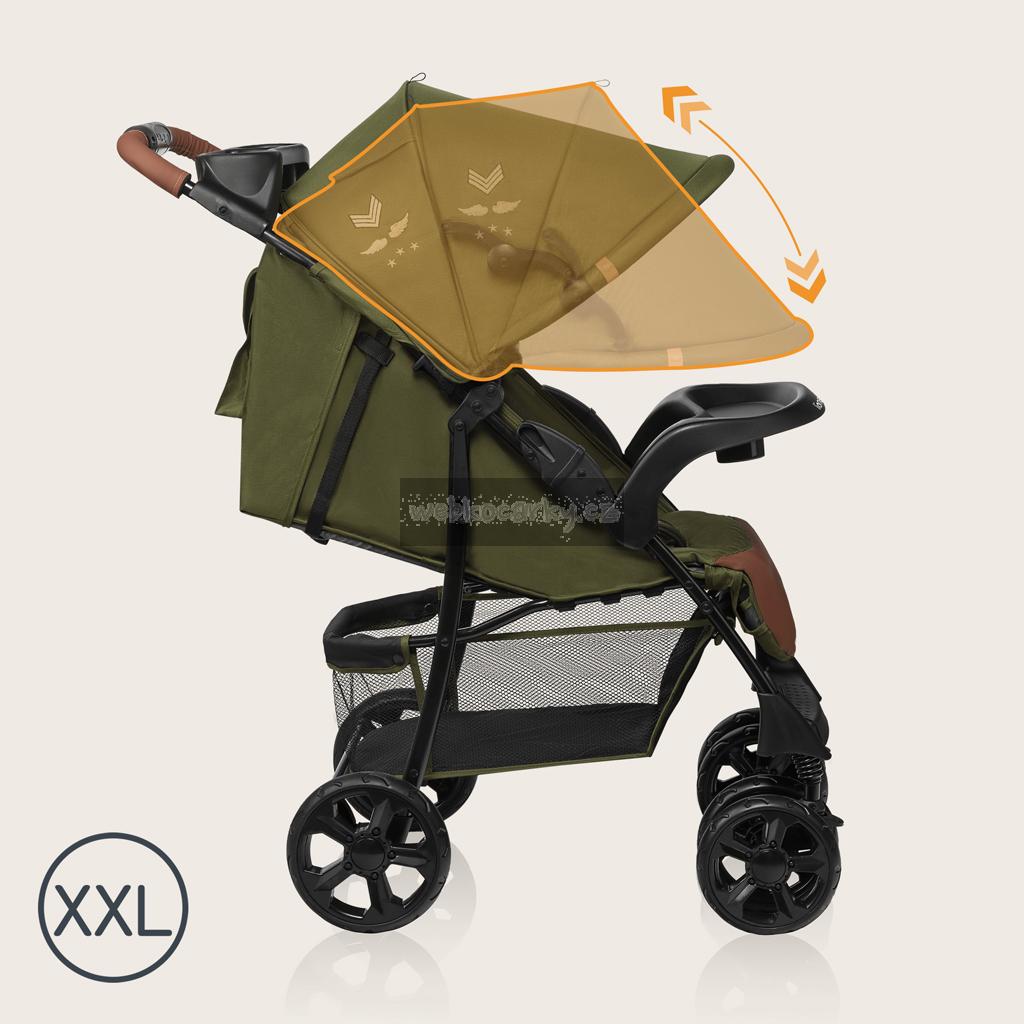 Sedačka se stříškou XXL: Velkorysá sedačka poskytuje dítěti dostatek prostoru pro pohodlnou pozici. XXL stříška účinně chrání před sluncem, deštěm a větrem. Procházka je pro batole pohodlná a příjemná.