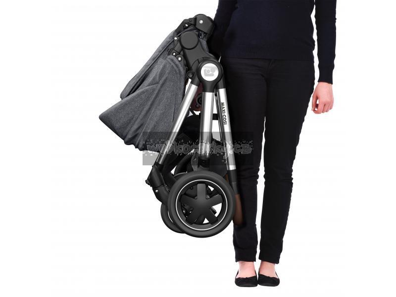 - Po složení do kompaktního tvaru je možné kočárek postavit