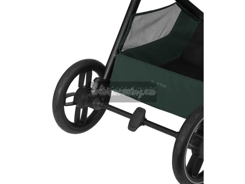 Přední otočná kola lze zaaretovat, což spolu s odpružením všech čtyř kol zajišťuje hladkou jízdu i v terénu. Kola jsou odolná proti propíchnutí a snadno je můžete odmontovat, což ještě více usnadňuje skladování. Kočárek má také praktickou nožní brzdu, která se jednoduše ovládá sešlápnutím.
