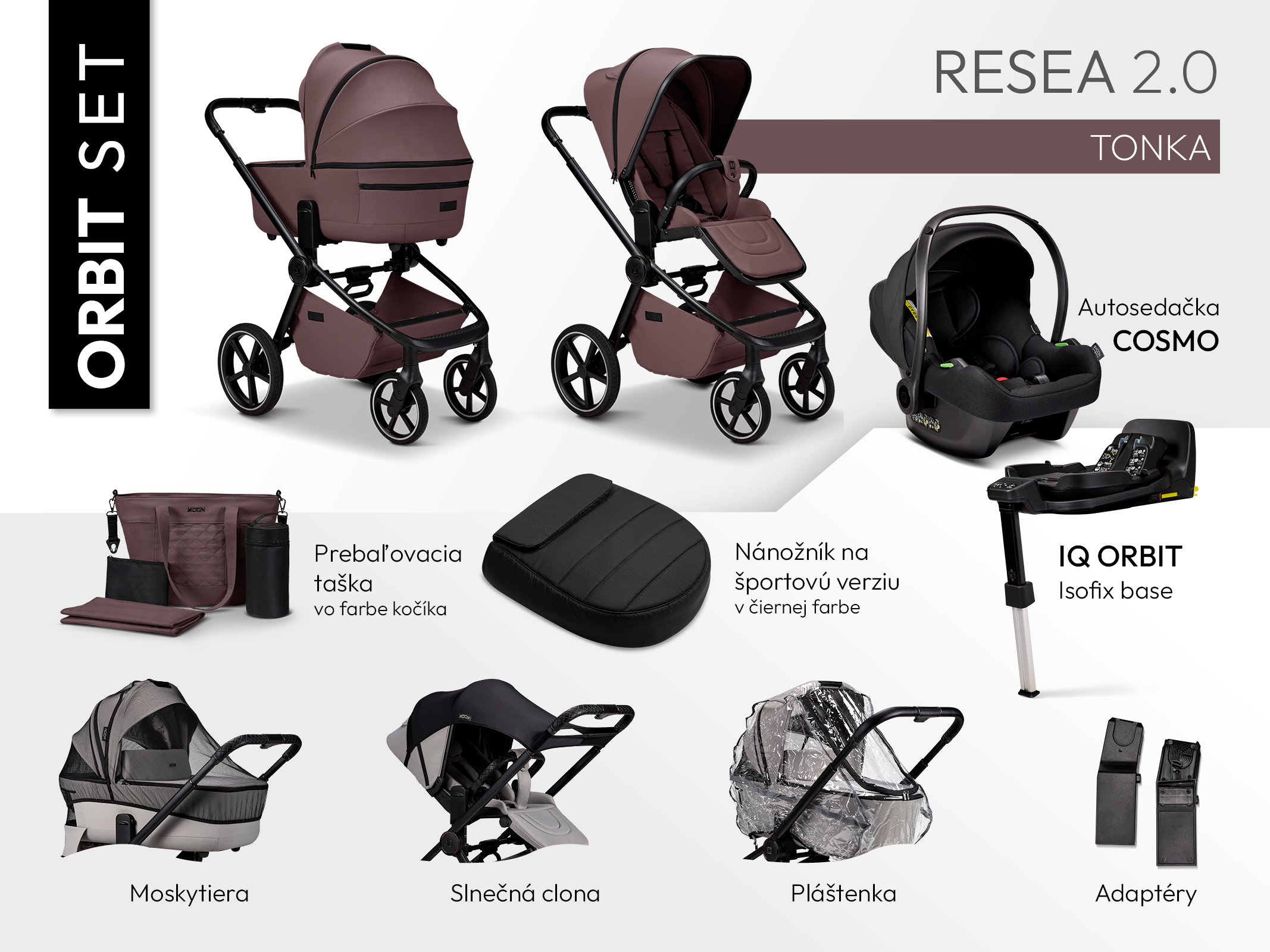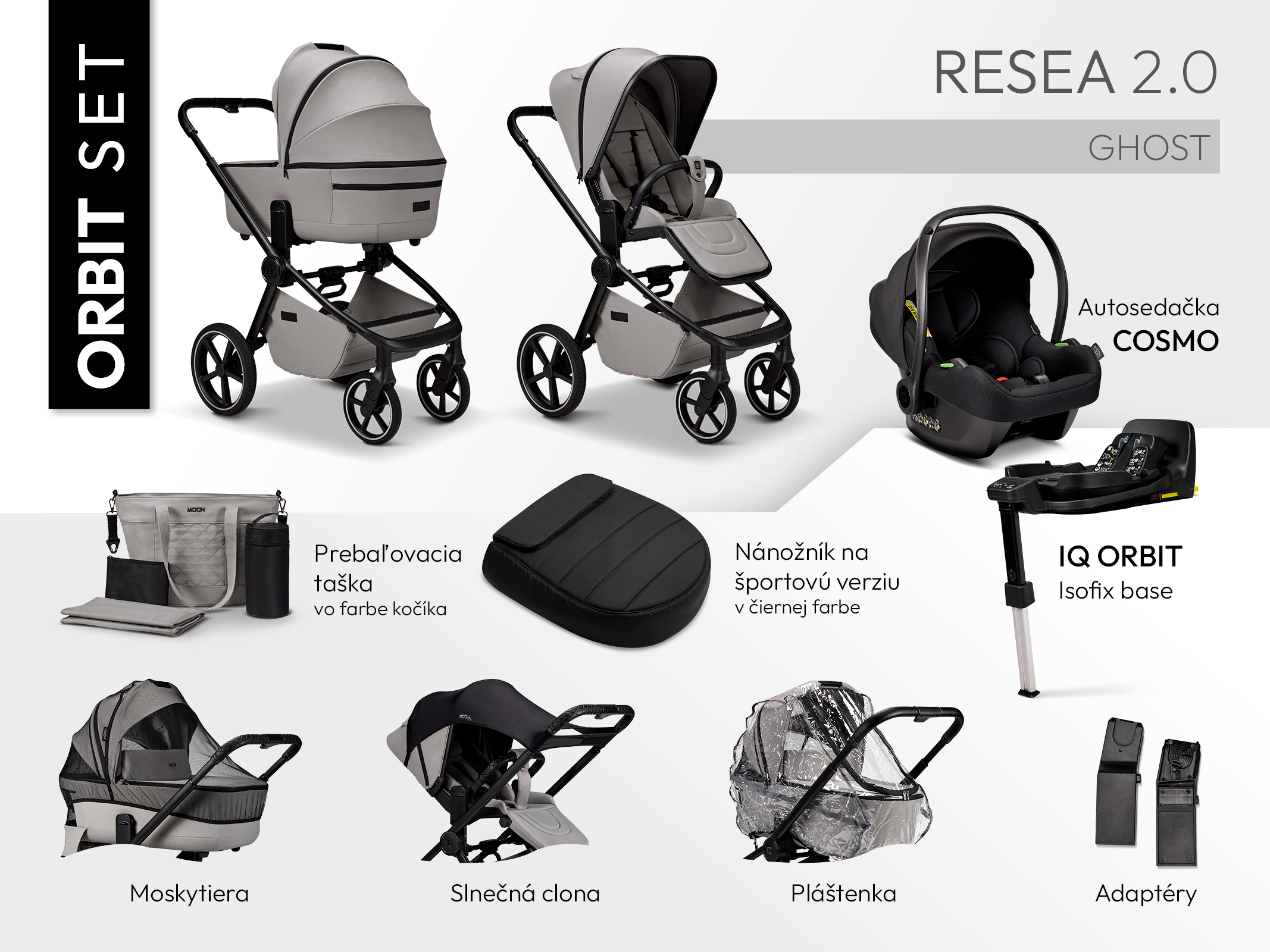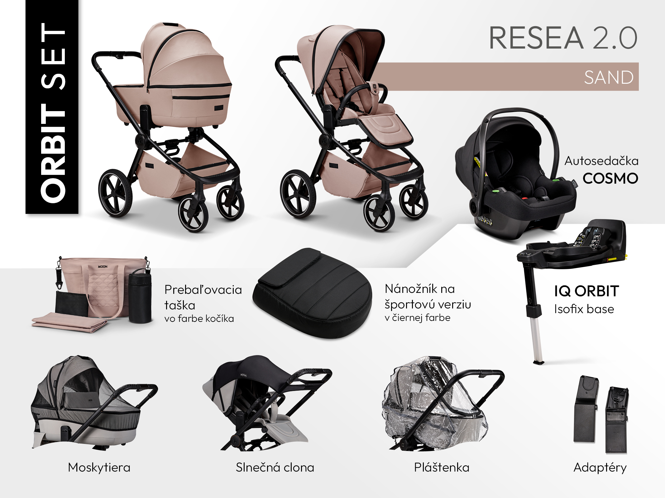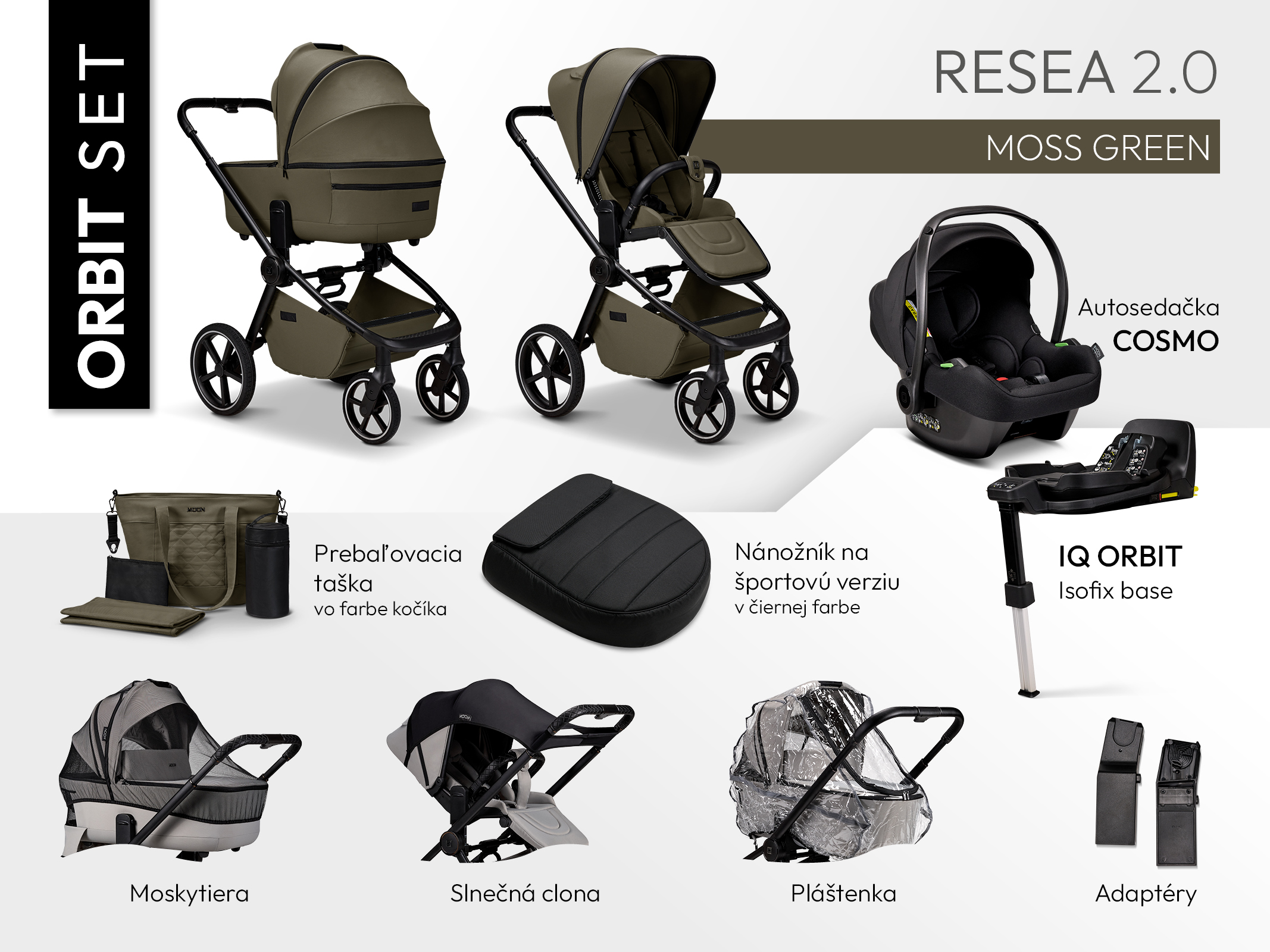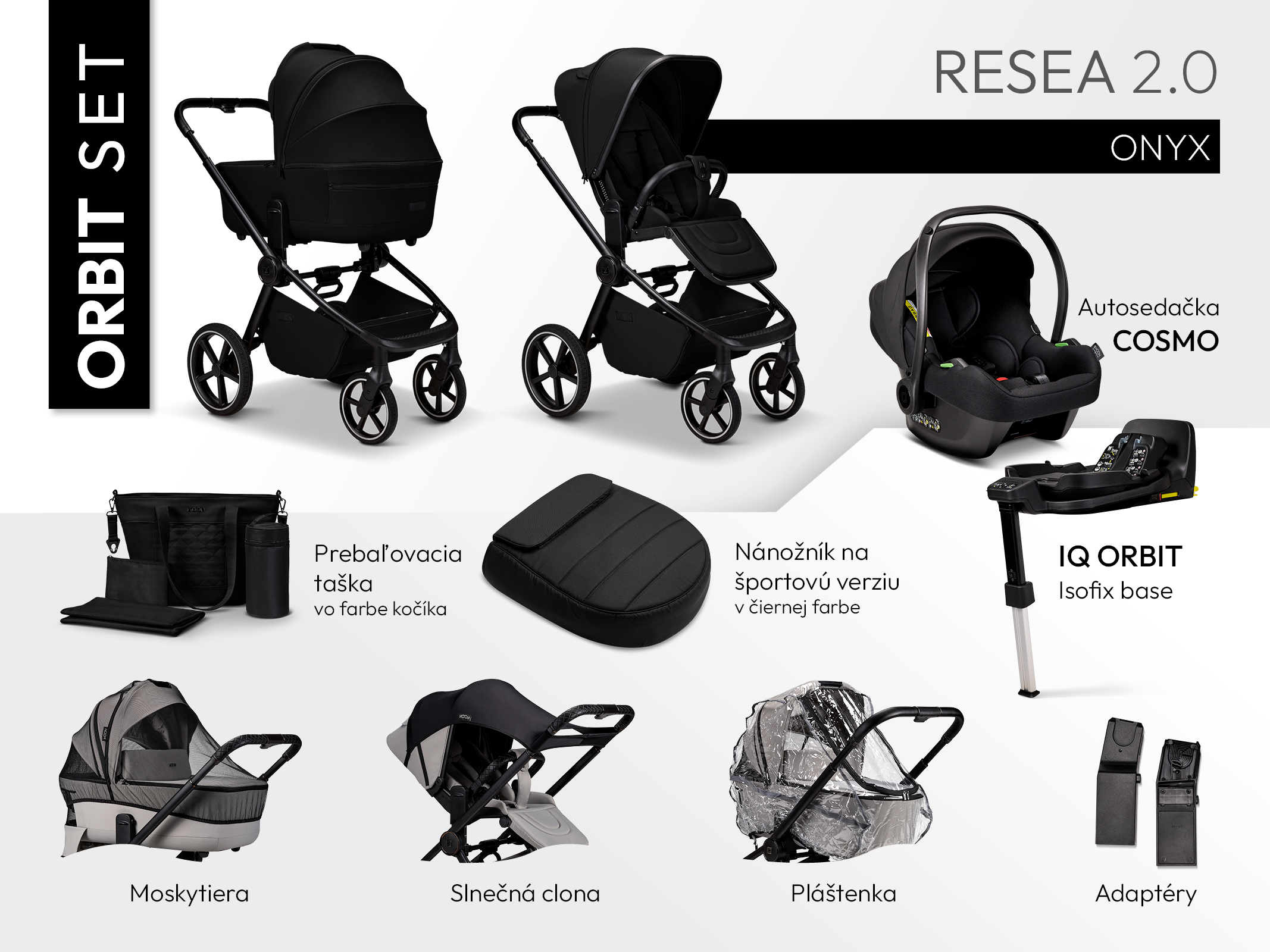 Pro rodiče, kteří chtějí mít vše potřebné pohromadě, je k dispozici ORBIT SET, který kromě samotného kočárku obsahuje také: