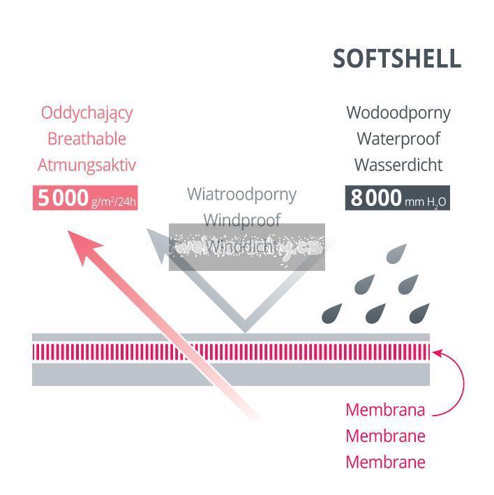 - Funkční látka softshell: voděodolná, ale prodyšná.