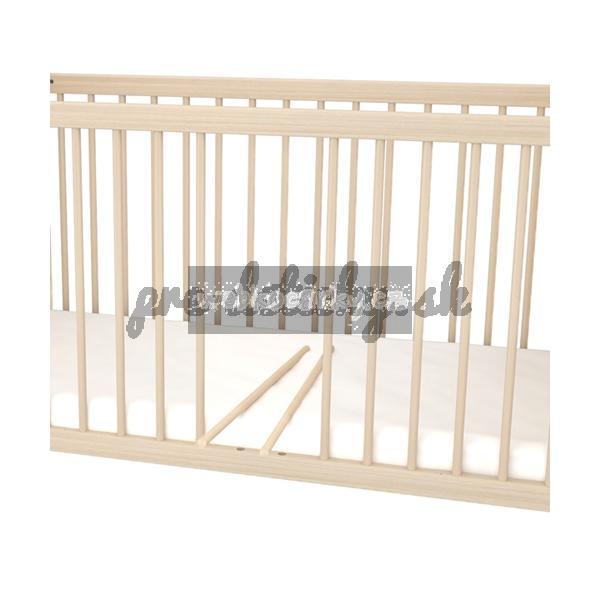 - Čelní bočnice postýlky je opatřena 3 odnímatelnými šprušlemi, aby dítě mohlo, když povyroste, samo z postýlky vylézat