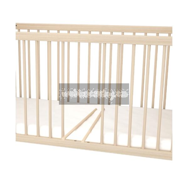 - Čelní bočnice postýlky je opatřena 3 odnímatelnými šprušlemi, aby dítě mohlo, když povyroste, samo z postýlky vylézat