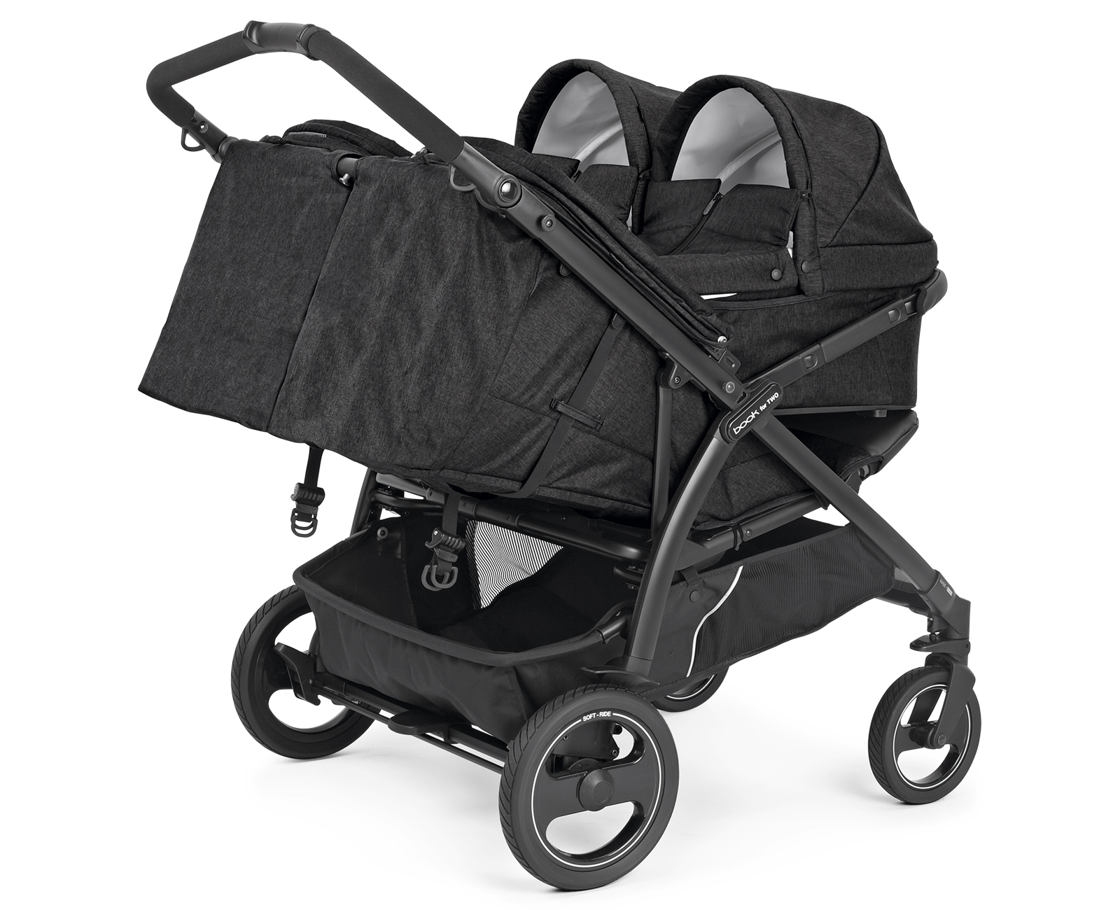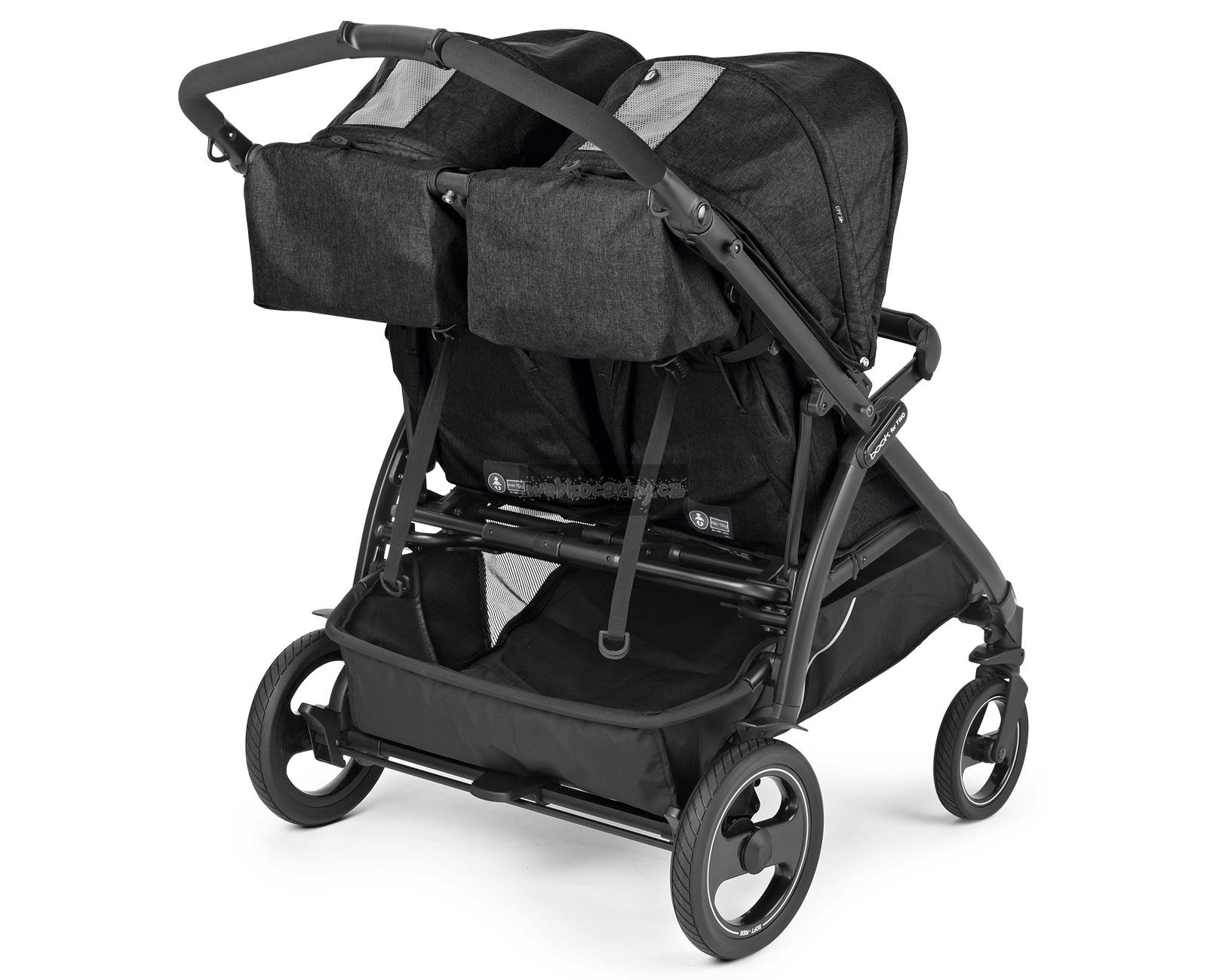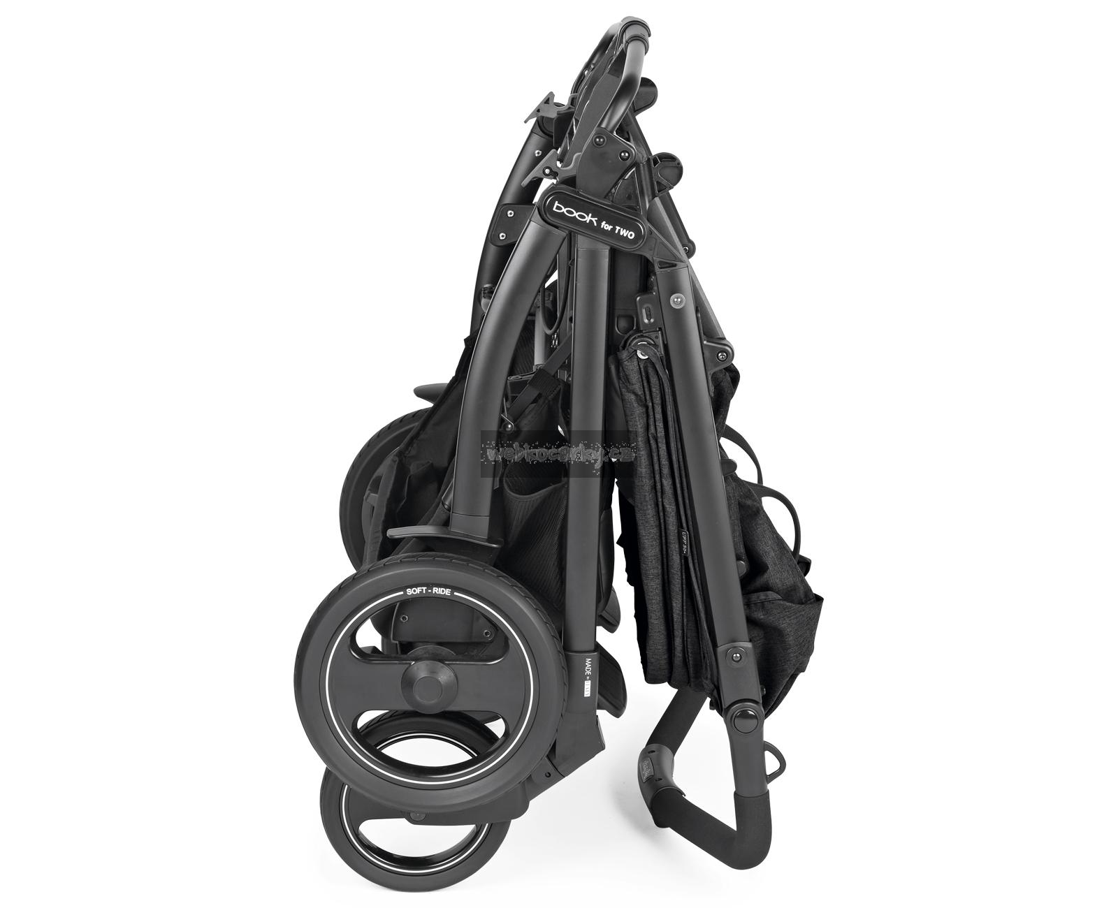V Itálii vyráběný dvojčatový kočárek Book For Two vyčnívá z řady především díky svým vlastnostem a praktickým funkcím. Je navržen tak, aby dětem poskytoval maximální pohodlí, ale zároveň byl extrémně hbitý na každém povrchu. Je vhodný pro dvojčata nebo sourozence podobného věku již od narození (0-36 měsíců) a s šířkou pouhých 74 cm umožňuje jízdu i skrze nejužší uličky. Pro pohodlné a snadné ovládání lze rukojeť kočárku výškově přizpůsobit dle rodiče a kočárek lze zabrzdit pomocí centrální brzdy. Odpružená Soft Ride kola se vzorkem a 12 kuličkovými ložisky umožňují dokonalou ovladatelnost pouze jednou rukou. Sportovní sezení jsou vybavena samostatně polohovatelnými opěrkami zad a nohou, UPF 50+ stříškami a otevíracím předním madlem v ECO kůži. Pod kočárkem se nachází prostorný košík nejen na nákup a celý kočárek lze jednou rukou složit do kompaktních rozměrů, přičemž ve složeném stavu stojí kočárek samostatně.