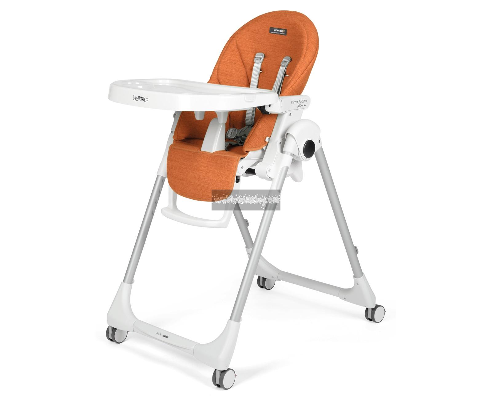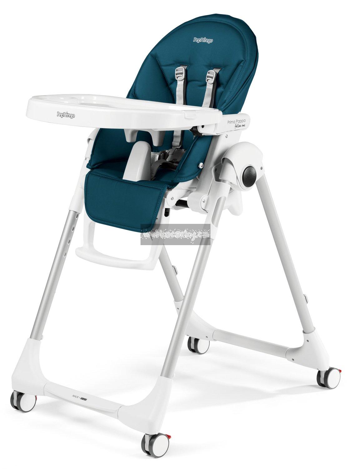 Židlička roste s Vaším dítětem od narození až do 3 let: během prvních několika měsíců může být židlička Prima Pappa Follow Me používána jako pohodlné, relaxační naklápěcí lehátko. Od 6 měsíců věku dítěte poslouží jako jídelní židlička pro krmení a hraní a později, bez polohovacího tácku, k sezení u stolu společně s dospělými. Díky 4 kolečkům lze židličku snadno přemisťovat po vaší domácnosti. Celou židličku lze výškově nastavit do 7 pozic, její opěrka nohou je nastavitelná do 3 pozic a zádová opěrka do 5 pozic (více než 150 °). Pro snadnou údržbu je polstrování vyrobené z PVC a Eco-kůže. Dvojitý polohovatelný a odnímatelný tácek s držákem na láhev je vhodný i do myčky na nádobí a ve spodní části je opatřený bezpečnostní přepážkou, která zabraňuje vyklouznutí dítěte z židličky. Ve složeném stavu stojí samostatně a zabírá málo místa.