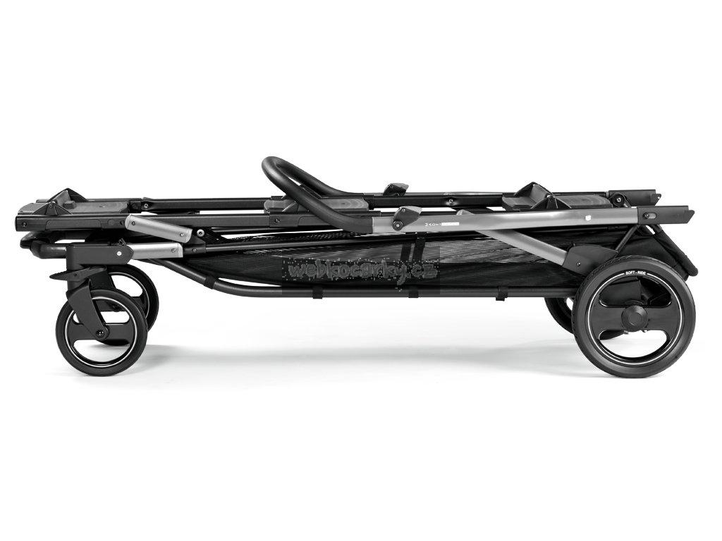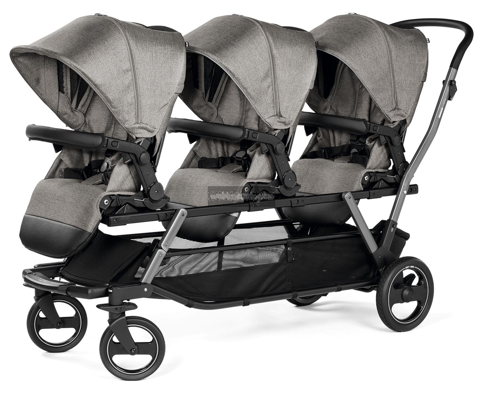 Praktický sportovní kočárek pro trojčata. Nastavitelný volant se dobře drží a má zabudované řízení předních kol s možností aretace. Na podvozek lze s pomocí sytému Ganciomatic připevnit až tři sportovní nástavby Primo Giro nebo tři autosedačky Peg Pérego.