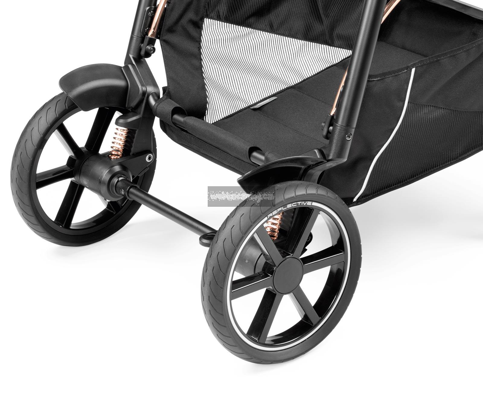 Pneumatiky Soft Ride se vzorkem, viditelné odpružení a kuličková ložiska zajišťují hbitou ovladatelnost v jakémkoli terénu. Přední kola lze otočit nebo zablokovat. Díky odrazkám na pneumatikách je kočárek ve tmě lépe vidět. Pohodlné centrální brzdové lanko.