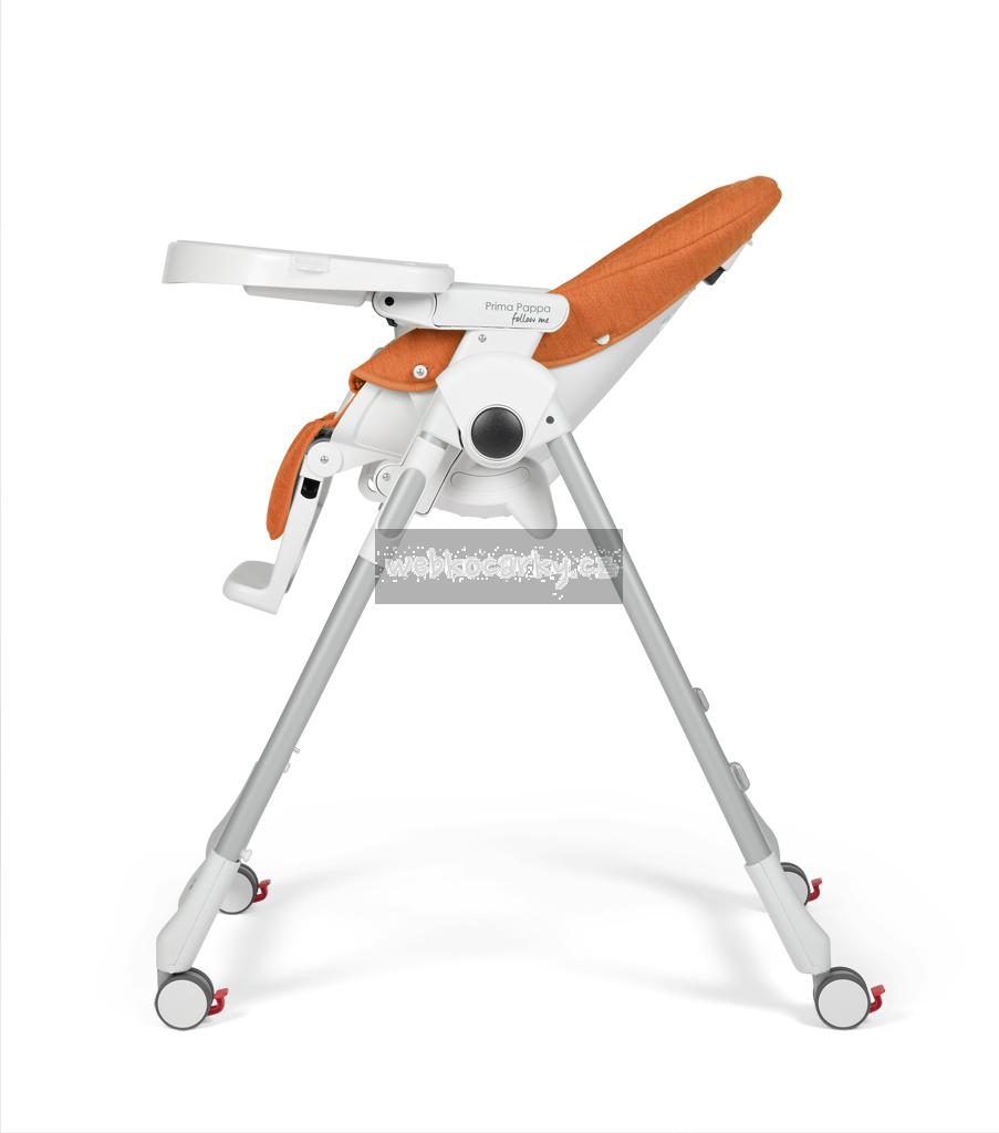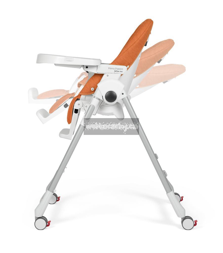 Židlička roste s Vaším dítětem od narození až do 3 let: během prvních několika měsíců může být židlička Prima Pappa Follow Me používána jako pohodlné, relaxační naklápěcí lehátko. Od 6 měsíců věku dítěte poslouží jako jídelní židlička pro krmení a hraní a později, bez polohovacího tácku, k sezení u stolu společně s dospělými. Díky 4 kolečkům lze židličku snadno přemisťovat po vaší domácnosti. Celou židličku lze výškově nastavit do 7 pozic, její opěrka nohou je nastavitelná do 3 pozic a zádová opěrka do 5 pozic (více než 150 °). Dvojitý polohovatelný a odnímatelný tácek s držákem na láhev je vhodný i do myčky na nádobí a ve spodní části je opatřený bezpečnostní přepážkou, která zabraňuje vyklouznutí dítěte z židličky. Ve složeném stavu stojí samostatně a zabírá málo místa.