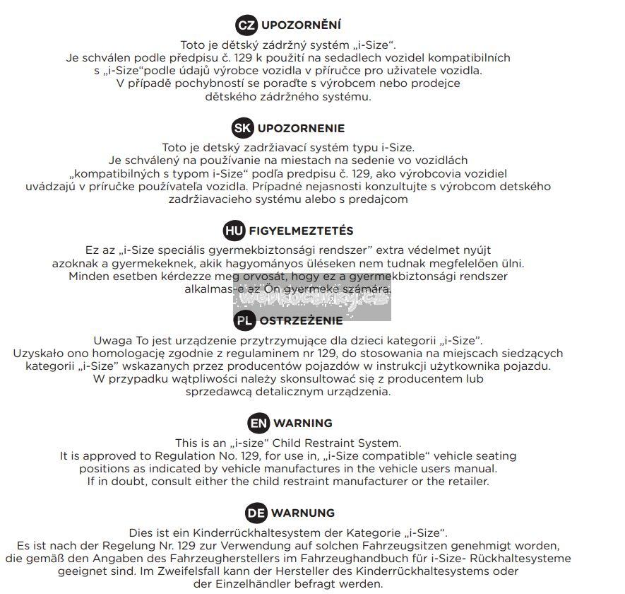Toto je dětský zádržný systém „i-Size“. Je schválen podle předpisu č. 129 k použití na sedadlech vozidel kompatibilních s „i-Size“ podle údajů výrobce vozidla v příručce pro uživatele vozidla. V případě pochybností se poraďte s výrobcem nebo prodejcem dětského zádržného systému.
