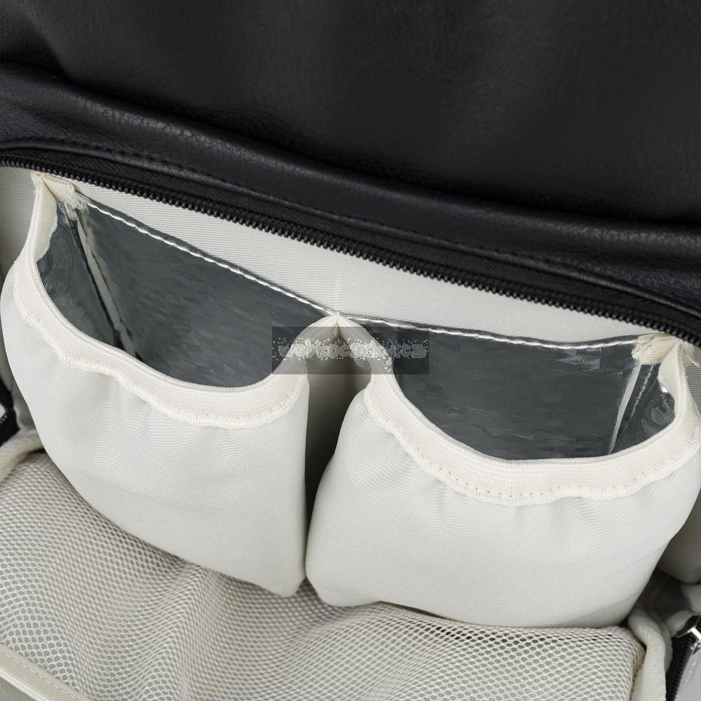 Batoh váží méně než kilogram a je vyroben z kvalitního voděodolného PU materiálu pro stabilitu a dlouhou životnost. Boční odnímatelné popruhy umožňují batoh snadno připevnit na kočárek jakékoli značky. Ramenní popruhy s extra vrstvou pěny zaručují pohodlí i při dlouhodobém nošení a vnitřní podšívka ve světlé barvě usnadňuje rychlé nalezení věcí, které potřebujete, a udržování pořádku.