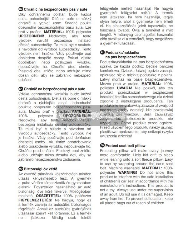 UPOZORNĚNÍ Nedovolte, aby tento výrobek narušil bezpečnou instalaci dětské autosedačky. Ta musí být v souladu s návodem od výrobce autosedaček. Tento výrobek není hračka. Vždy používejte pod dohledem dospělé osoby. Pokud zjistíte opotřebování nebo poškození výrobku, nepoužívejte jej. Chraňte před ohněm. Plastový obal zničte nebo udržujte mimo dosah dětí, aby se zabránilo nebezpečí udušení.