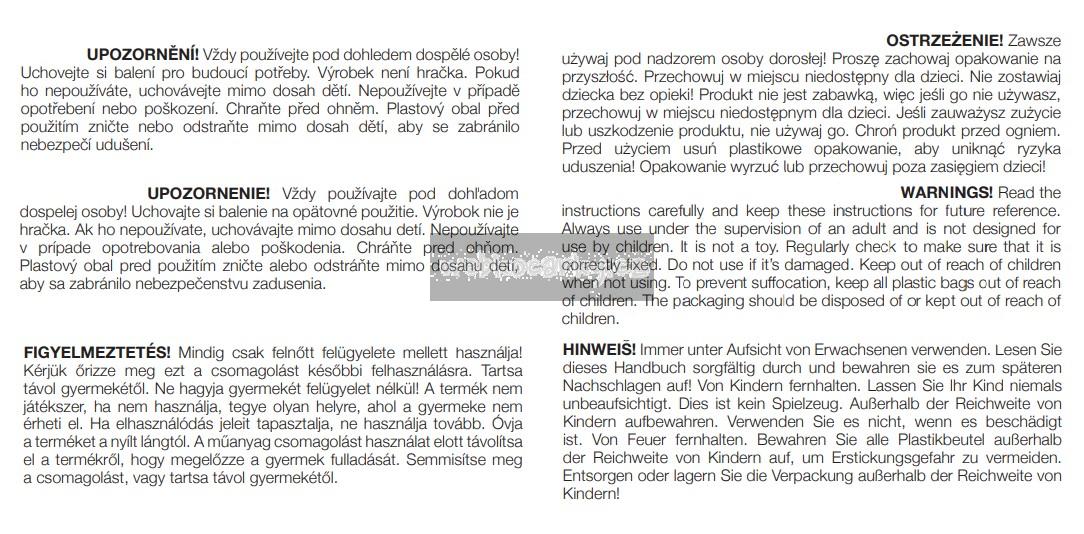 UPOZORNĚNÍ Vždy používejte pod dohledem dospělé osoby! Uchovejte si balení pro opětovné použití. Výrobek není hračka. Pokud jej nepoužíváte, uchovávejte mimo dosah dětí. Nepoužívejte v případě opotřebování nebo poškození. Chraňte před ohněm. Plastový obal zničte nebo udržujte mimo dosah dětí, aby se zabránilo nebezpečí udušení.