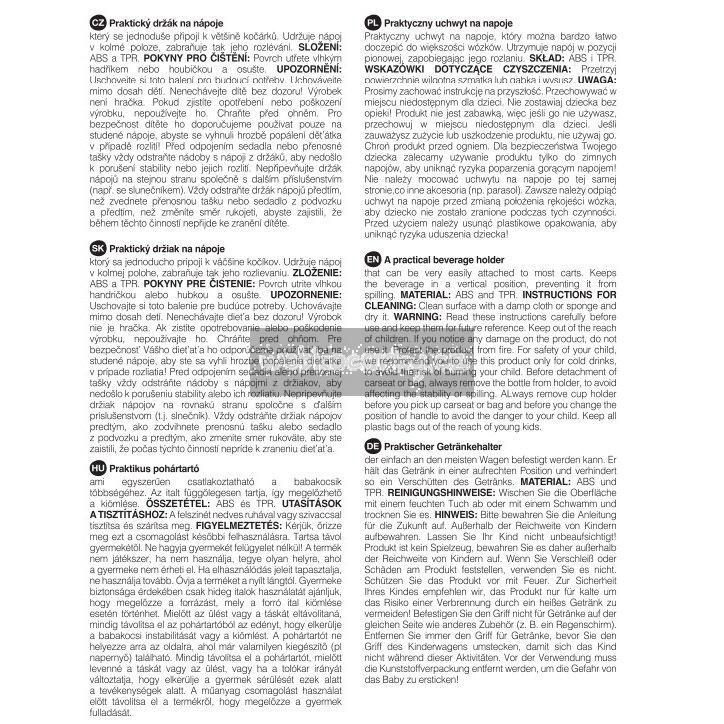 Uschovejte si balení pro budoucí potřeby. Uchovávejte mimo dosah dětí! Nikdy nenechávejte dítě bez dozoru! Výrobek není hračka. Pokud zjistíte opotřebování nebo poškození výrobku, nepoužívejte jej. Chraňte před ohněm. Pro bezpečnost Vašeho dítěte jej doporučujeme pouze na studené nápoje, abyste se vyhnuli hrozbě popálení dítěte v případě rozlití! Před odpojením sedadla nebo přenosné tašky vždy odstraňte nádoby s nápoji z držáků, aby nedošlo k doporučení stability nebo jejich rozlití. Nepřipevňujte držák na nápoje na stejnou stranu společně s dalším příslušenstvím. Vždy odstraňte držák nápojů předtím, než zvednete přenosnou tašku nebo sedátko z podvozku a předtím, než změníte směr rukojeti, abyste zajistili, že během těchto činností nedojde ke zranění dítěte.