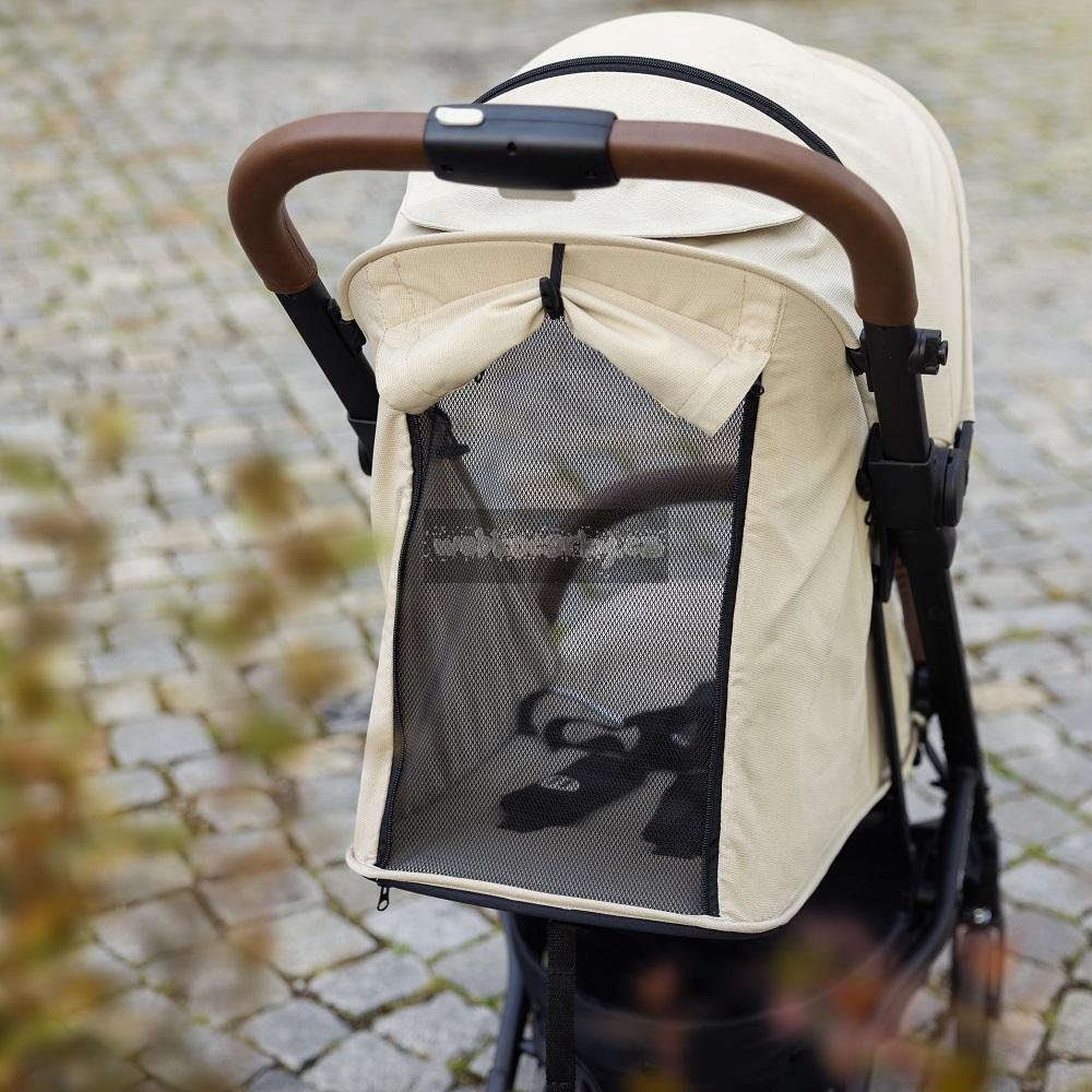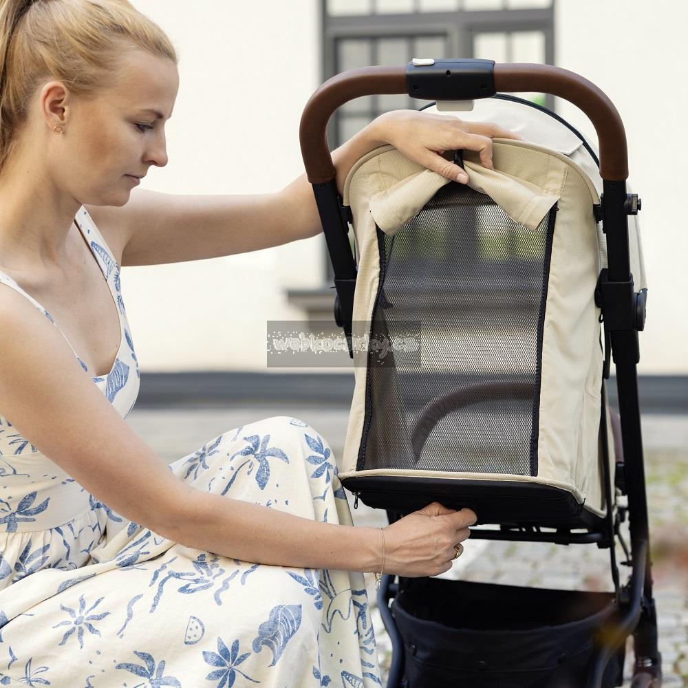 - Odvětrání zadní strany kočárku – možnost vyrolování potahu a odhalení síťky v zadní části zádové opěrky