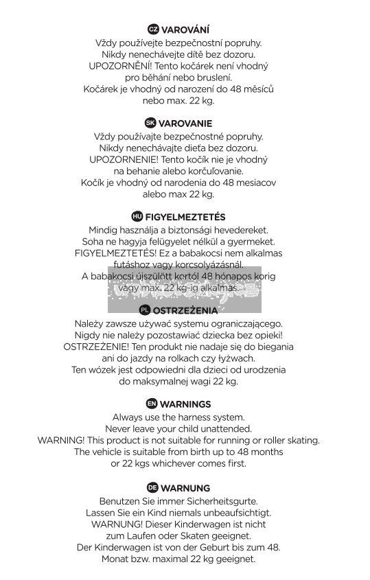 Čištění a údržba: Pokud byl podvozek kočárku vystaven slané vodě, co nejdříve jej opláchněte vodou. Produkt čistěte pomocí hadříku a jemných čisticích prostředků. Potah sedadla lze vyprat při teplotě 30 °C. Produkt neskládejte ani neukládejte, když je mokrý, ani jej neskladujte ve vlhkých podmínkách.