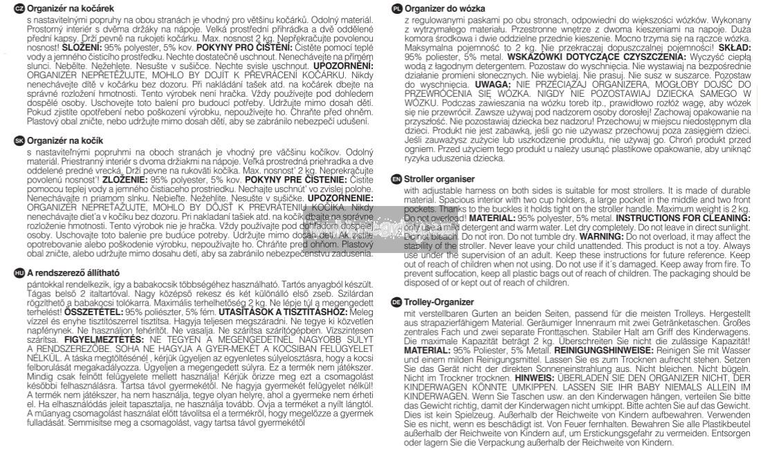 UPOZORNĚNÍ! Tašku nepřetěžujte, mohlo by dojít k převrácení kočárku! Nikdy nenechávejte dítě v kočárku bez dozoru. Při nakládání tašek na kočárek dbejte na správné rozložení hmotnosti. Tento výrobek není hračka. Vždy používejte pod dohledem dospělé osoby. Uschovejte si toto balení pro budoucí potřeby. Pokud zjistíte opotřebení nebo poškození výrobku, nepoužívejte jej. Chraňte před ohněm. Plastový obal zničte nebo udržujte mimo dosah dětí, aby se zabránilo nebezpečí udušení.