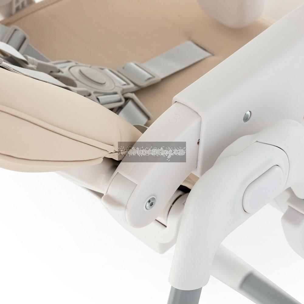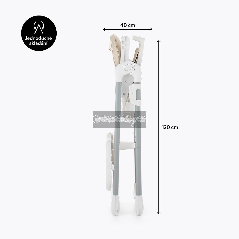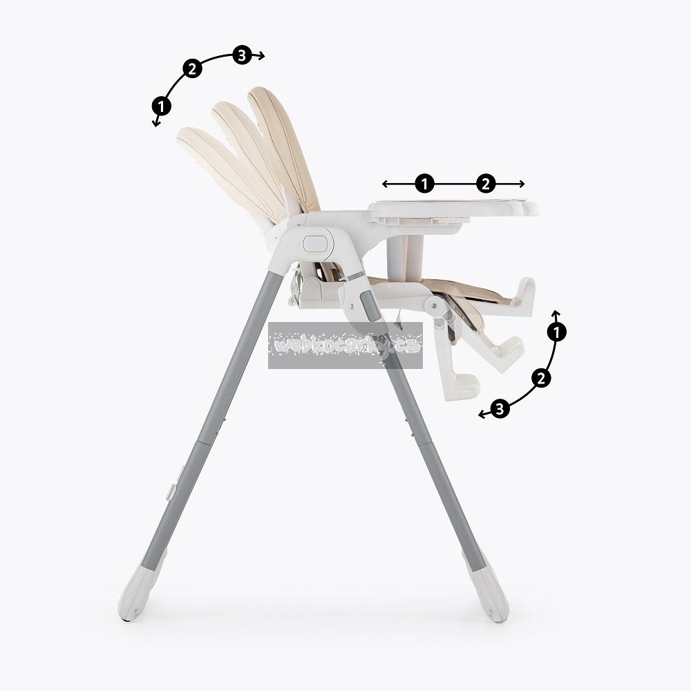 Péče o životní prostředí, kterou jsme při tvorbě této židle zohlednili, nezastínila nejdůležitější aspekty výrobku – byl totiž navržen tak, aby co nejbezpečněji zlepšil každodenní život děťátka i rodičů. Židle má všechny funkce, které usnadňují každodenní krmení: lze ji snadno sundat a vyčistit, má 5-bodové bezpečnostní pásy, nastavitelnou opěrku zad, nastavitelnou opěrku nohou, nastavitelnou výšku, dvě polohy pro podnos s horní částí, kterou lze mýt v myčce nádobí. Stabilní konstrukce židle zajistí bezpečnost vašeho dítěte bez ohledu na to, jak je aktivní nebo pohyblivé. Vysoce kvalitní provedení, promyšlená konstrukce, moderní a originální design a kompaktní skládání jsou nadčasové vlastnosti, které zajistí pohodlí pro vaše dítě od okamžiku, kdy se naučí sedět.