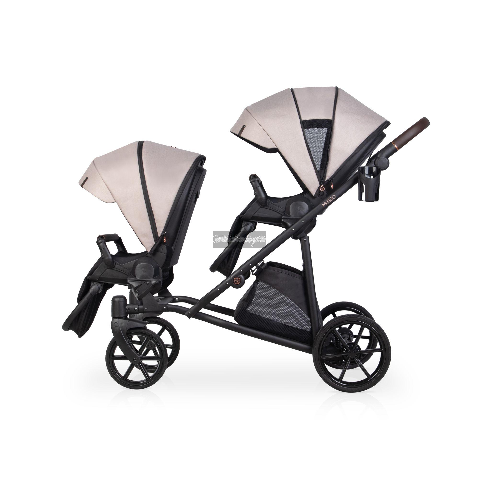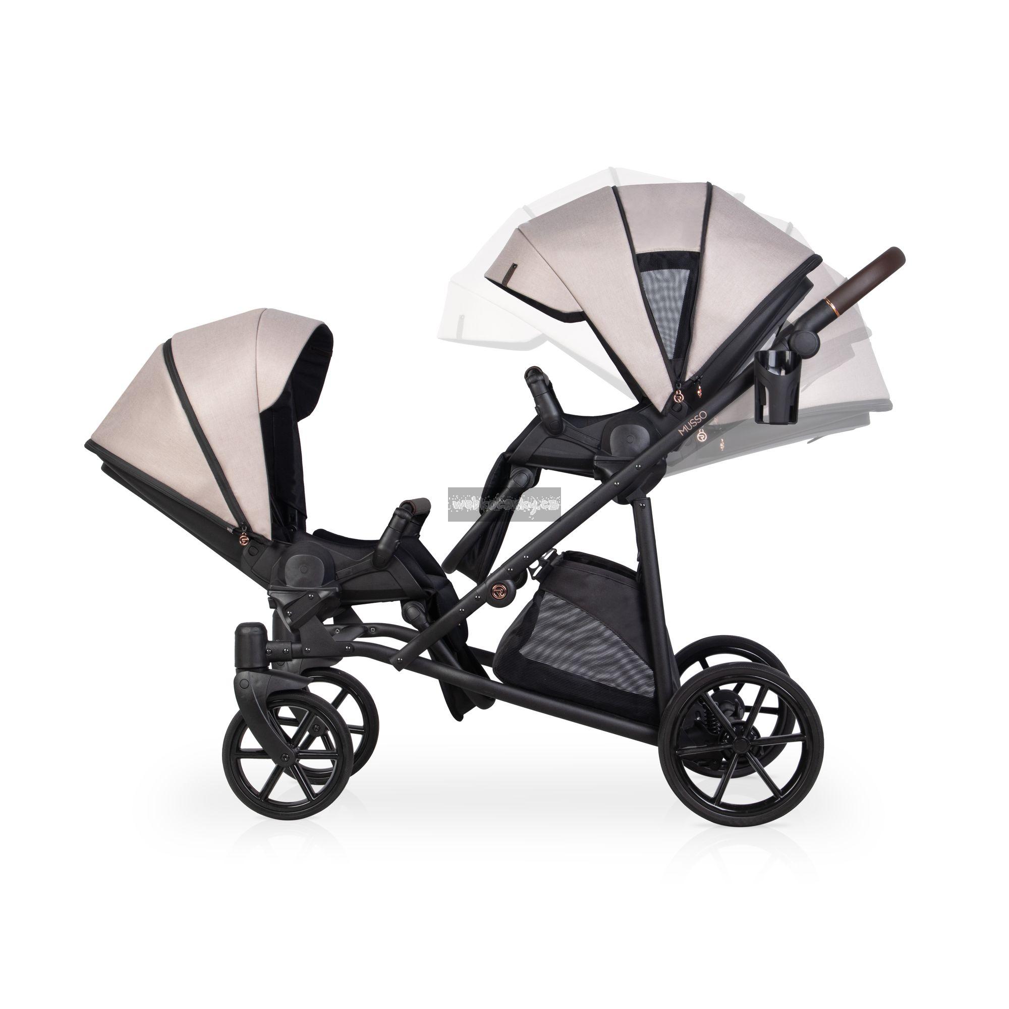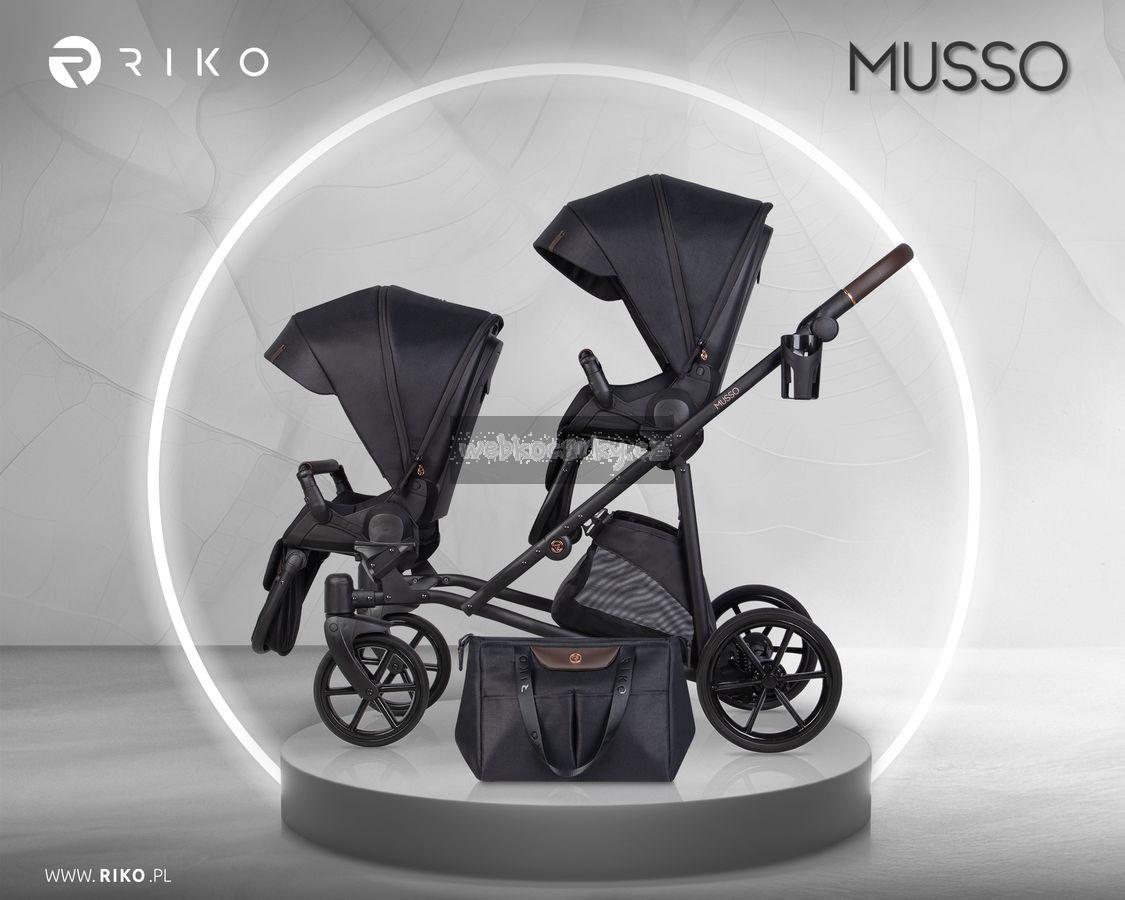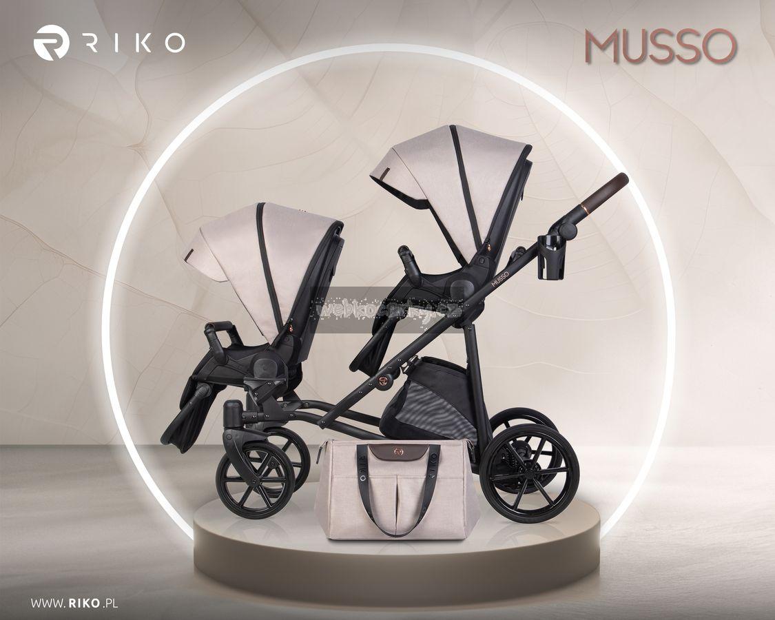 Tandemový kočárek RIKO MUSSO umožňuje až 16 různých konfigurací sedaček kočárků, gondol a autosedaček. Je možné umístit dvě sedadla dopředu a dozadu, stejně jako čelem k sobě nebo zády k sobě. MUSSO by RIKO je jeden z mála kočárků na trhu, který navíc umožňuje libovolnou konfiguraci spojení jedné gondoly s jednou sedačkou kočárku, včetně možnosti montáže sedačky na přední modul čelem dopředu, přičemž gondola je namontována na zadní modul. Na rám kočárku lze samozřejmě umístit dvě korbičky nebo dvě autosedačky současně.
