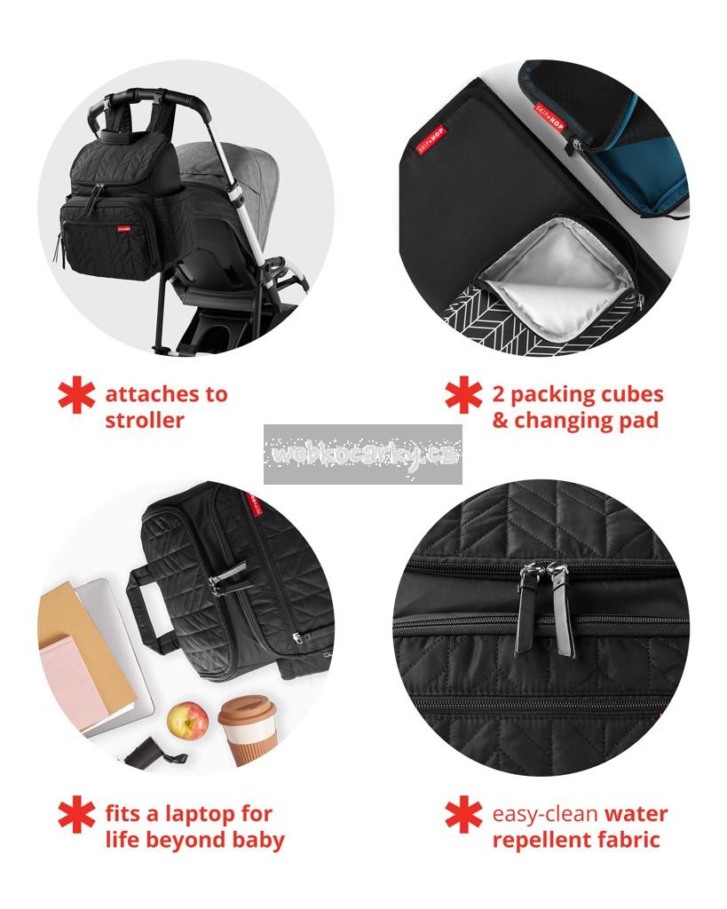 V batohu zůstane vše po ruce díky elastickým vnitřním kapsám a izolovaným bočním kapsám na láhev. Vnitřní kapsa na přebalovací podložku můžete využít při cestování i jako přihrádku na notebook.