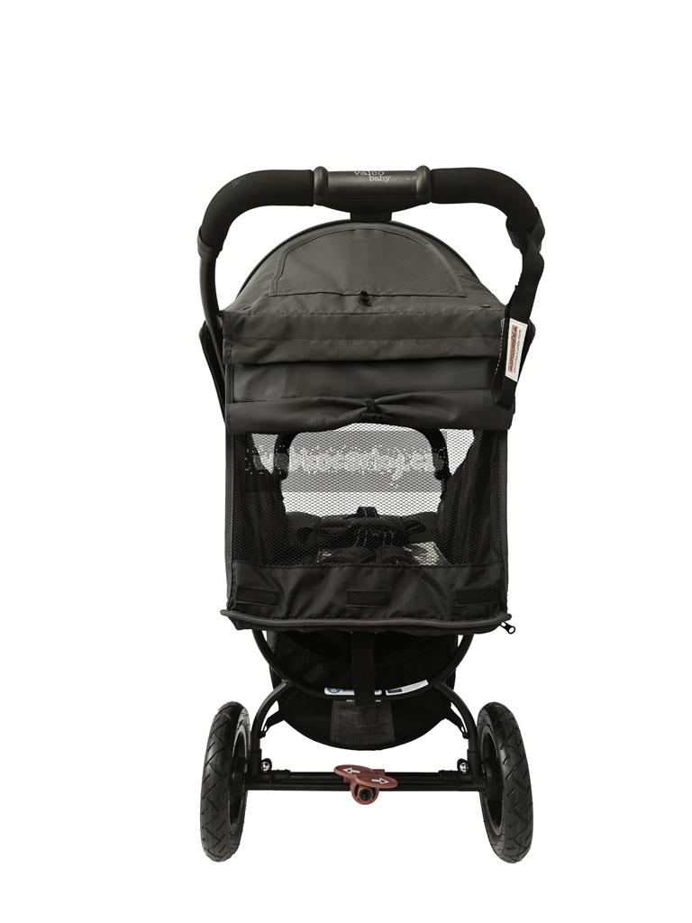 - Zadní část opěrky obsahuje dvě praktické kapsy, tuto část lze navíc srolovat, čímž se odkryje síťované okénko, díky kterému může vzduch v kočárku cirkulovat bez omezení iv teplejších dnech.
